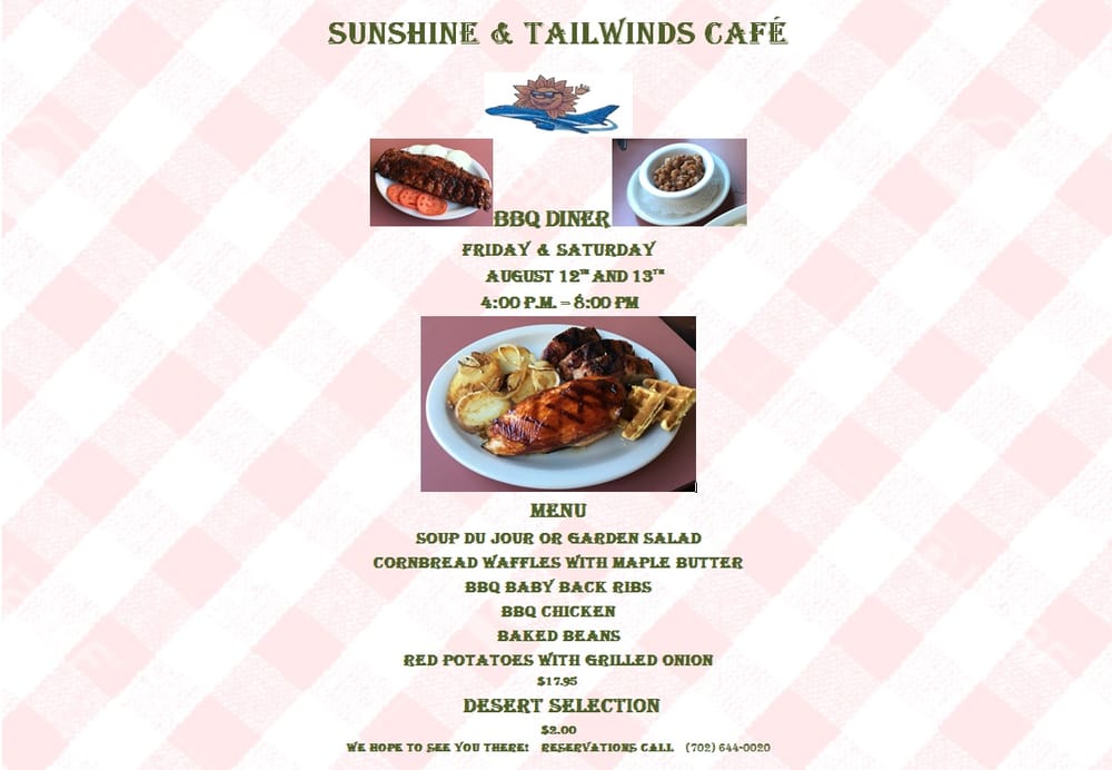 Welcome to Sunshine & Tailwinds Cafe, a charming American breakfast and brunch spot located at 2730 Airport Dr in North Las Vegas. With a variety of beverages including coffee, tea, and juices, this cafe offers a cozy atmosphere with a view of airplanes taking off and landing right outside the windows. The menu features delicious breakfast options like Eggs Benedict, Chicken Fried Steak, and Omelets with various fillings. Customers have raved about the friendly staff, great service, and tasty food. The cafe also offers delivery, takeout, and catering options, making it a convenient choice for any meal. Don't miss the chance to visit this hidden gem for a unique dining experience.